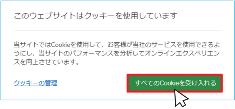 「Cookie を使⽤しています」が表⽰されたら「すべてのCookie を受け⼊れる」ボタンをクリックします。