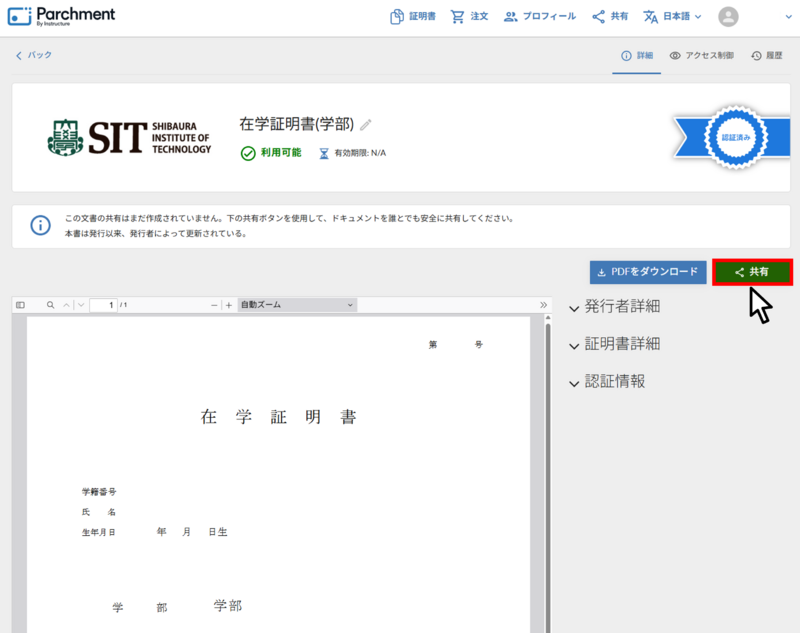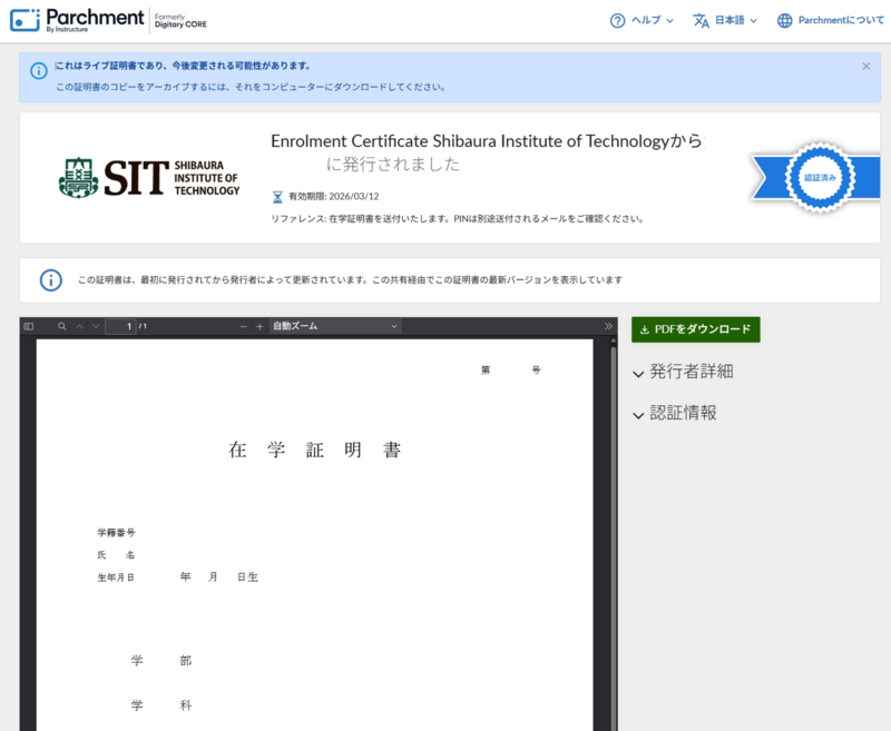 PDFを印刷すると、この証明書が⼤学から発⾏されたことを受領者が確認ができないため、お勧めできません。