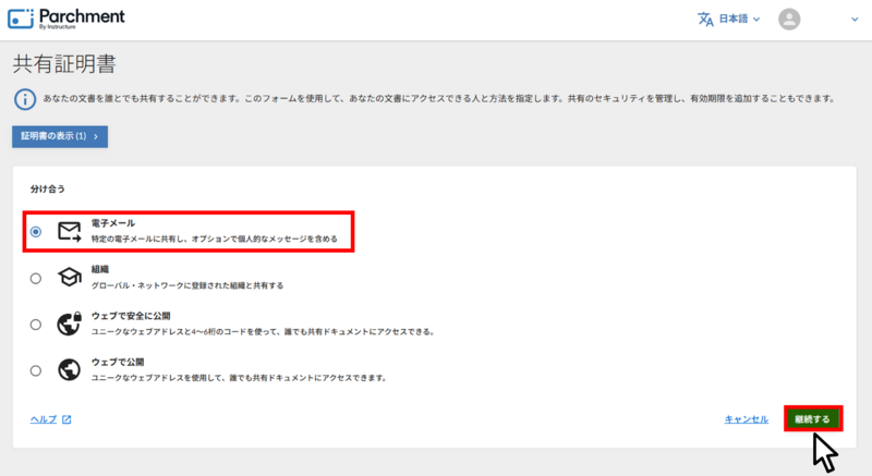 Parchmentのユーザー登録後、デジタル証明書の確認⽅法と、デジタル証明書を他者に共有(PDF ファイルをダウンロード)する⽅法です。