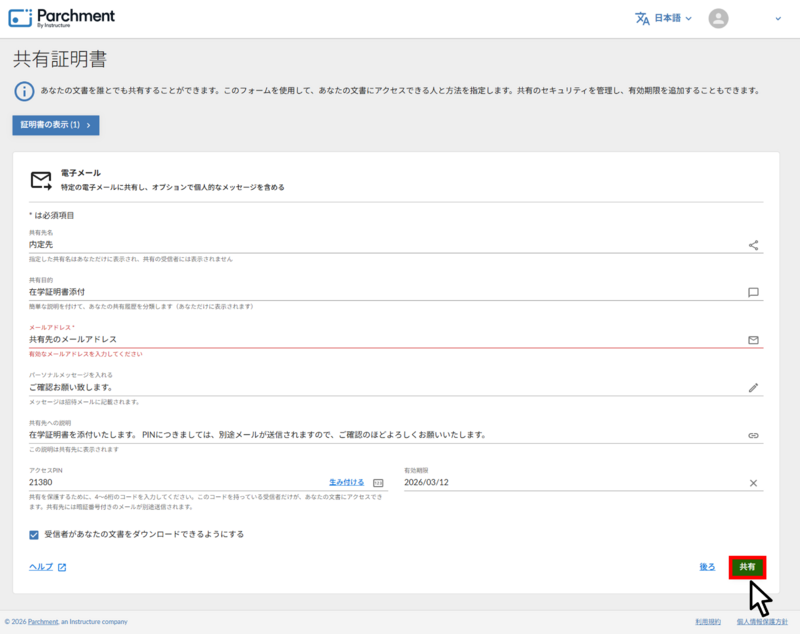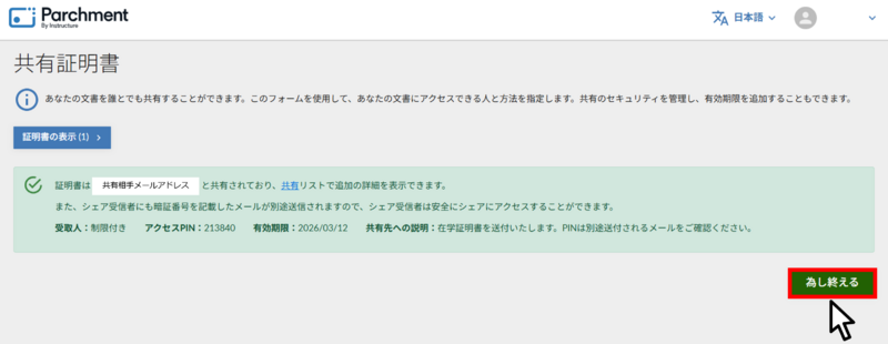 共有相手に証明書とアクセス PIN(開封⽤パスコード)がメールで送信されました。