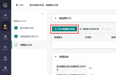 問題集の生成にて、「バンクから問題集を追加」からインポートした問題集を選択します。