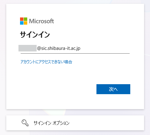 ※教職員が参照ログインするときは該当する学生の学籍番号を入力 - 学情ID@sic.shibaura-it.ac.jpを入力して「次へ」をクリック