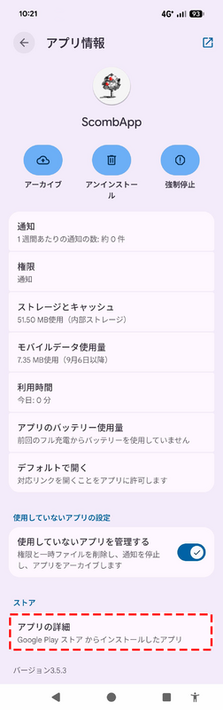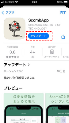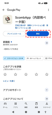 - Google Playストアの「ScombApp」の詳細画面になります。「更新」ボタンをタップします。