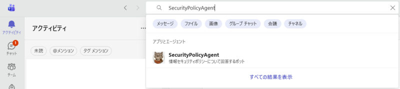 Teamsから「SecurityPolicyAgent」を検索して、チャットを開始できます。