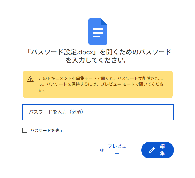 ブラウザ上のGoogle Driveにて、パスワード保護された上記形式のファイルを開くと、次のような警告が表示されます。