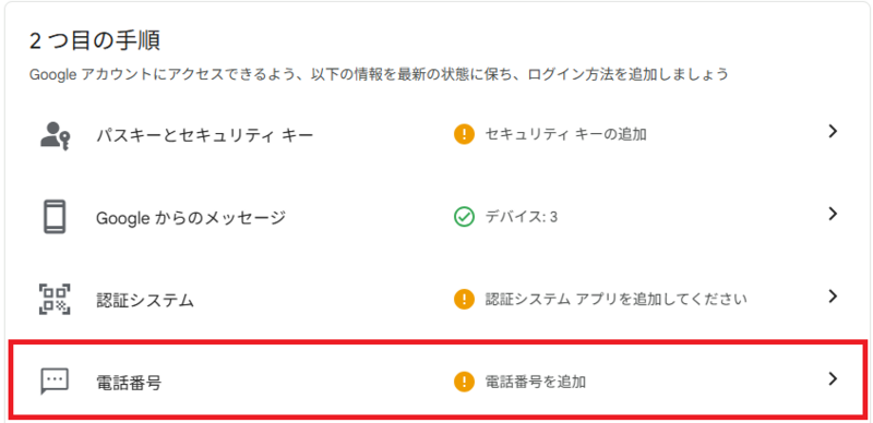 その他の認証方式追加、複数台のデバイス登録をすることを推奨します。