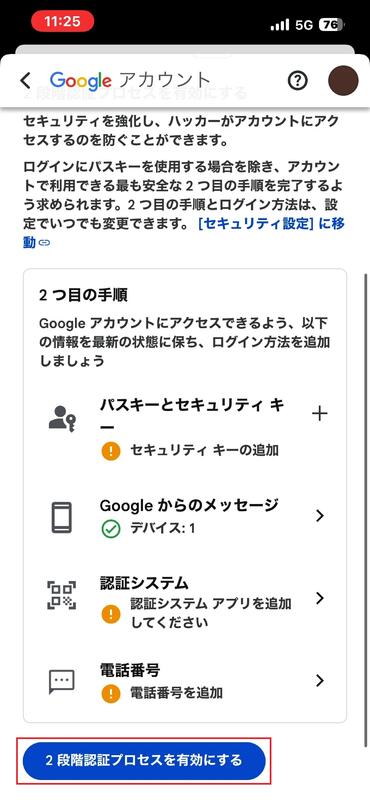 1-5. 「2段階認証プロセスを有効にする」をタップします。