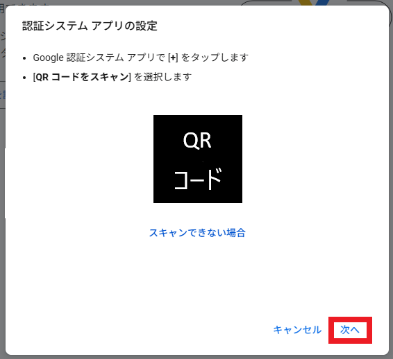 3-4. お使いのスマートフォンでGoogle Authenticatorアプリを起動し、「QRコードをスキャン」を選択