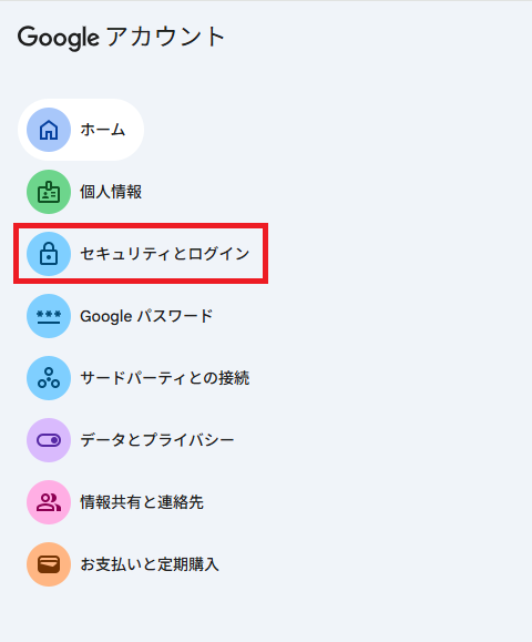 Googleアカウントにログインしたら、画面左側のセキュリティとログインを選択。