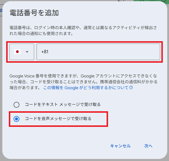 「コードを音声メッセージで受け取る」を選択後、次へを選択します。