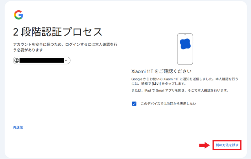 別の認証方法が表示された場合、「別の方法を試す」を選択します。