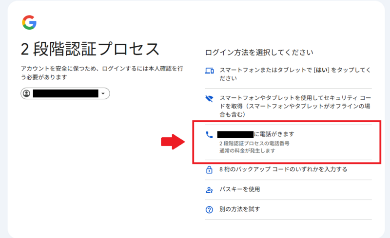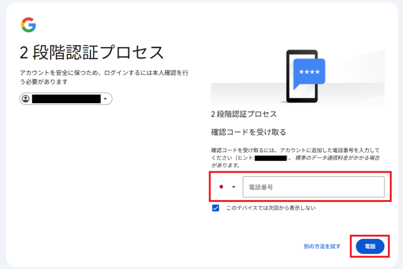 2段階認証登録時に設定した電話番号を入力し、「電話」を選択します。
