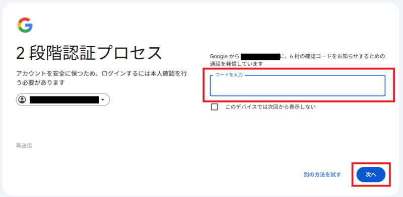 案内された6桁の確認コードを入力し、「次へ」を選択します。