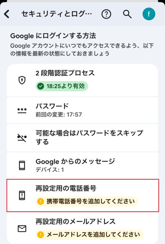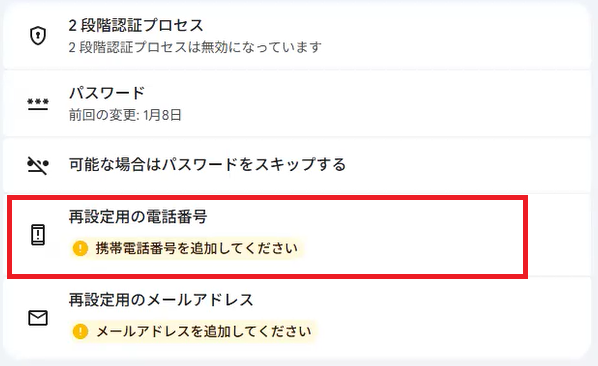 2.1.1. 「セキュリティとログイン」設定から「再設定用の電話番号」を開きます