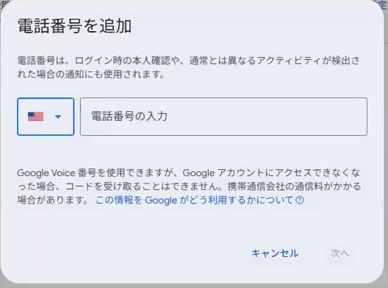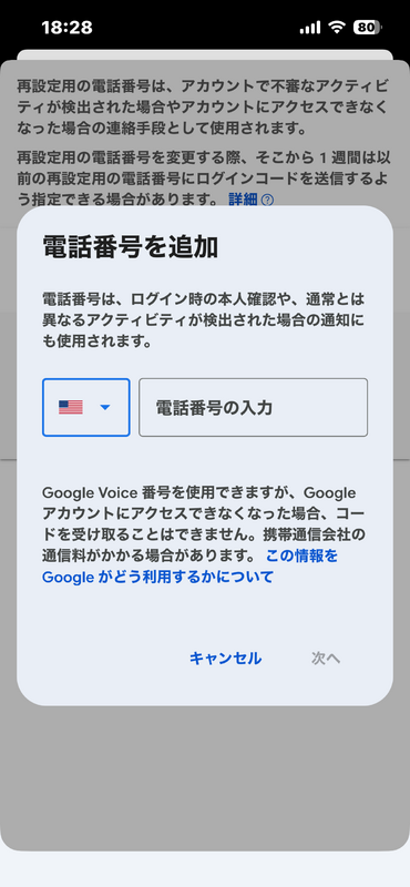 「コードを音声メッセージで受け取る」を選択後、次へを選択します。