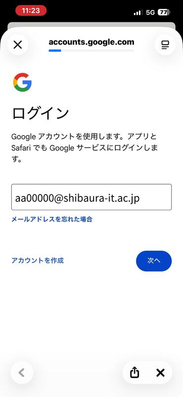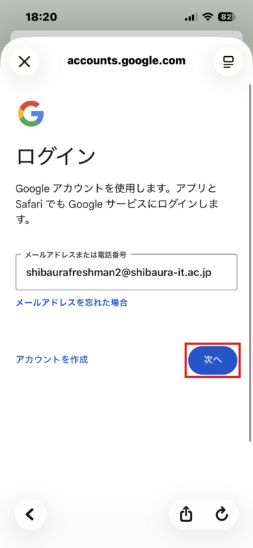 2.2. 大学用Gmailアドレスを入力して、【次へ】を選択
