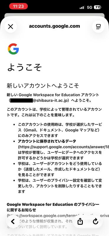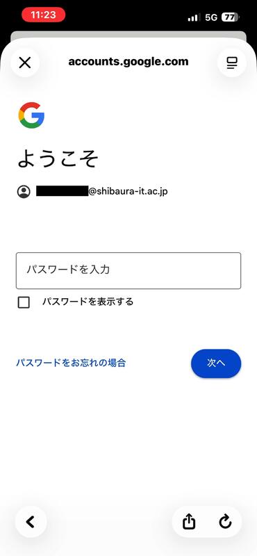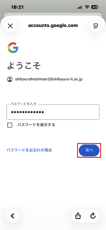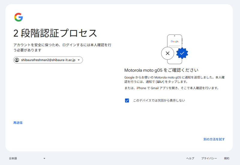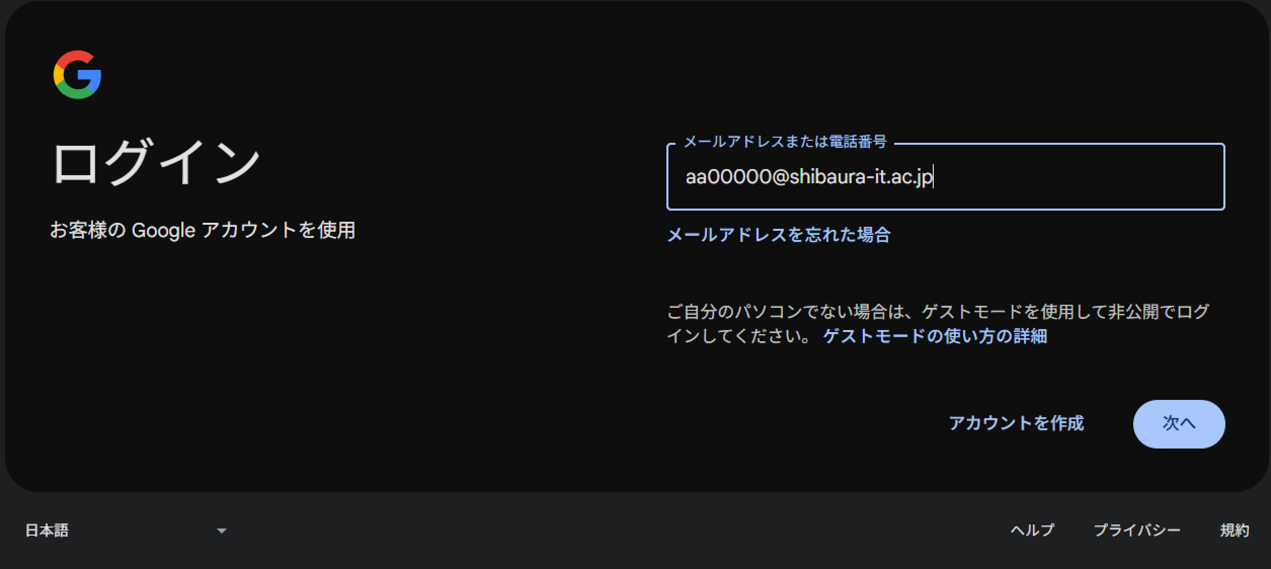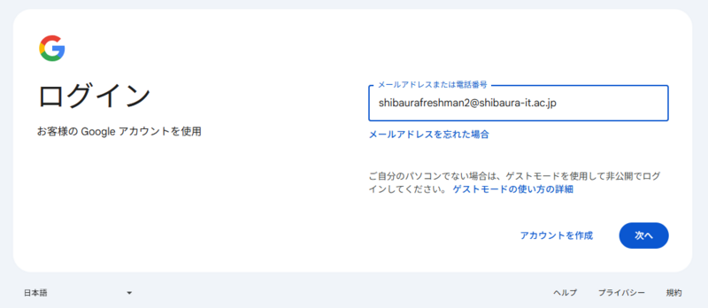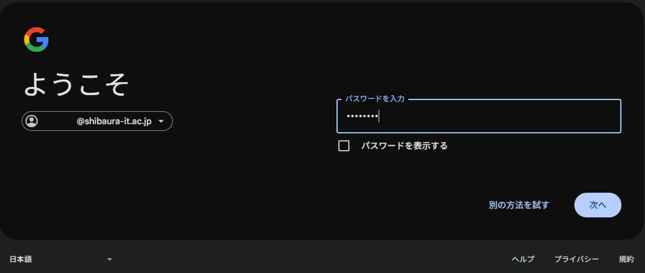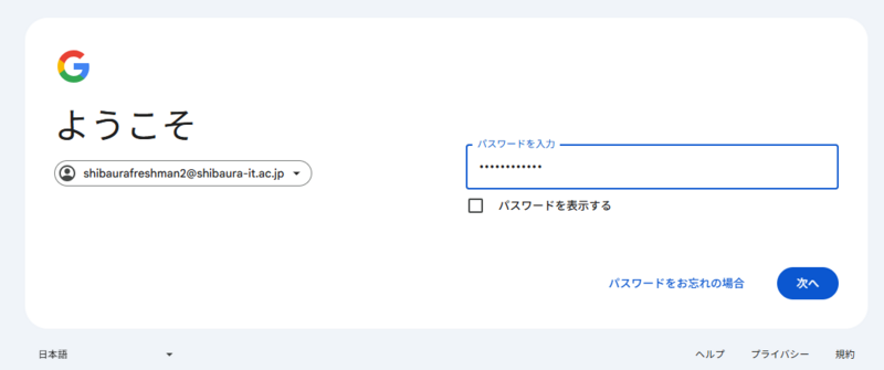 新入生のパスワードはステップ1で設定した Googleパスワード (Windowsパスワードと同じ)です。