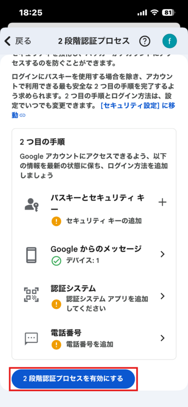 1.3.4. 2段階認証プロセスのページが開いたら、最下部までスクロールし、「2段階認証プロセスを有効にする」をタップします。
