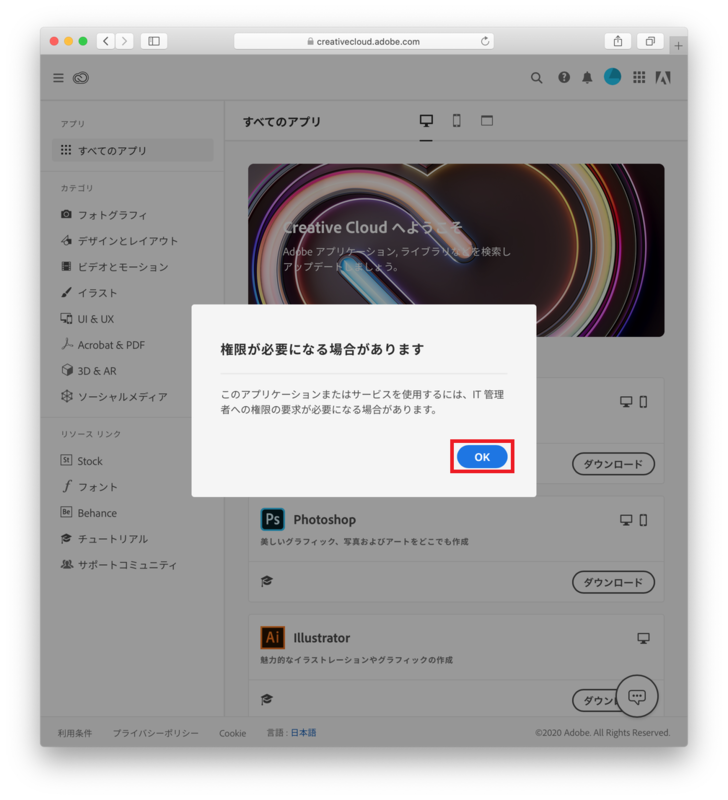 Adobe Creative Cloud アプリケーションのインストール(MacOS)