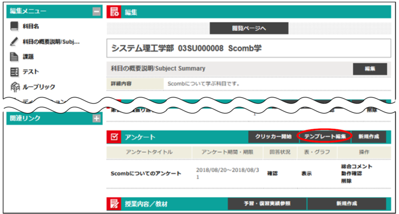 「科目編集TOP」画面のアンケートの[テンプレート編集]ボタンをクリックすると、[アンケートテンプレート一覧]画面に遷移します。