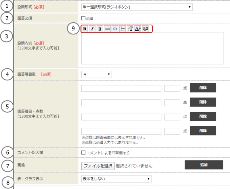※ 「点数」は集計の際に使用されます。マイナスの設定が可能です。(回答者には表示されません。)