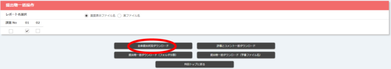 ホーム > サービス > 授業支援 > ScombZ > 全体提出状況ダウンロード 全体提出状況ダウンロード 2022/03/16 更新 全課題における全学生の提出状況をExcel ファイル(.xlsx)でダウンロードできます。 科目トップのページで[全体提出状況確認]ボタンをクリックし、「全体提出状況確認」画面に遷移します。 [全体提出状況ダウンロード]ボタンをクリックします。 以下のような、提出状況一覧のExcelファイルがダウンロードされます。