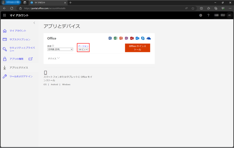 ※32ビット版を選択する場合は「バージョン」のタブから変更してください。