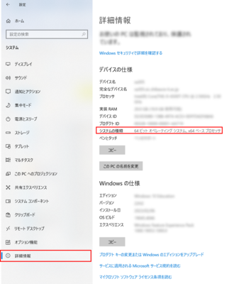 (使っているパソコンのバージョンは「設定>システム>詳細情報」の「デバイスの仕様>システムの種類」から確認できます。)