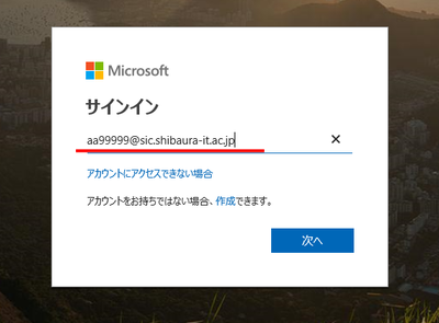 初めてアクセスする際は、サインインの画面になります。「学情ID@sic.shibaura-it.ac.jp」を入力して「次へ」を押します。