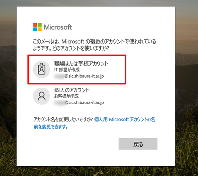 2.個人でマイクロソフトアカウントを取得している場合は、次のような選択画面が表示されますので、「職場または学校アカウント」をクリックします。