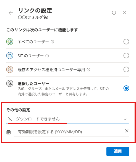 3.1.3 追加するユーザ( 学情ID@sic.shibaura-it.ac.jp ) を入力して適用を押します。