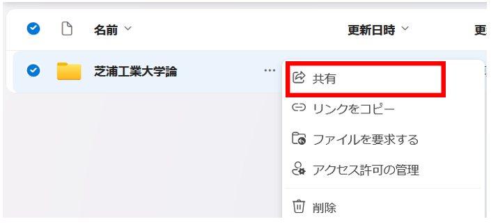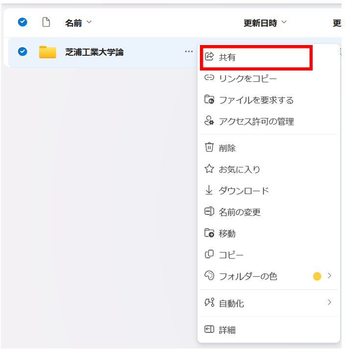 1.5.1 「1.2 共有するためのフォルダを作成する」で作成したフォルダを右クリックもしくは三点リーダーをクリックします。